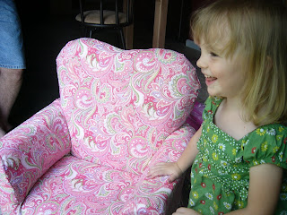 She's a doll! I love that picture of her when she sees the chair you re-covered for her. I think she likes it!